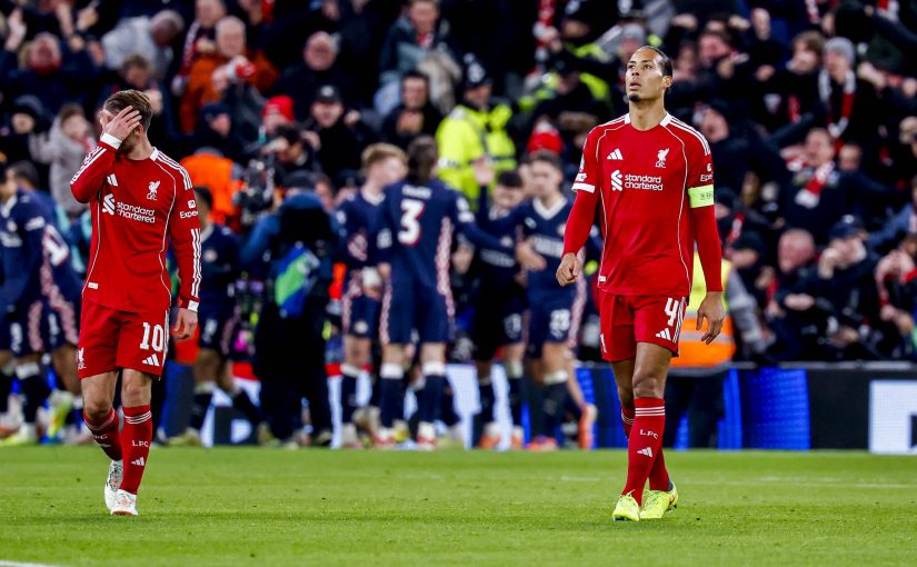 Virgil van Dijk dan Alexis Mac Allister terpukul setelah timnya kebobolan ketiga kalinya saat melawan PSV Eindhoven, Anfield, 26 November 2025. (IMAGO / Goal Sports Images)